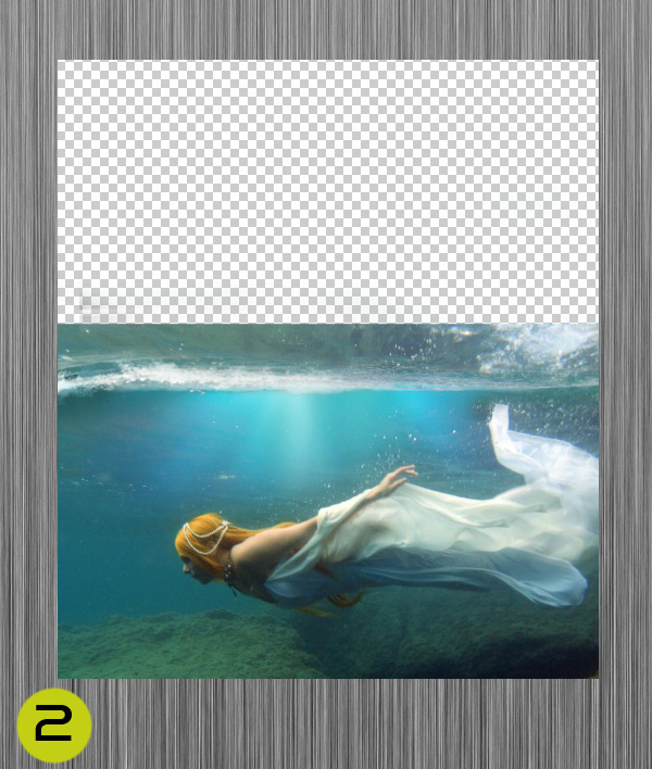 I often create a transparent layer at the beging because it’s easier for me to fit the pictures in.First we bring our mermaid stock on our transparent layer and the limit of the under water foam.We need only the foam from that stock so we’ll erase the other parts using a soft brush.